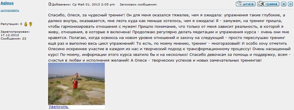 Я даже объяснить это не могу словами. Закончились мои бесконечные паники относительно неудач с мужчинами, изменилась философия. В этом тренинге очень много полезных техник и классных медитаций. Действительно тренинг многоразового пользования.